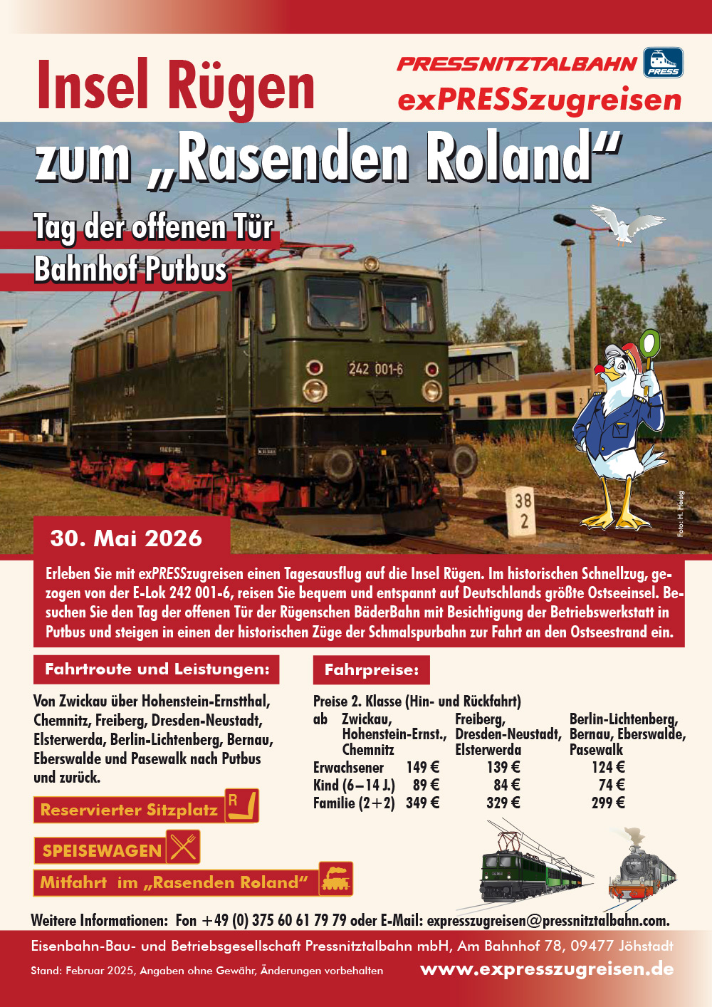 Weitere Informationen erhalten Sie unter 0375 606 17979. Hier nehmen wir auch Ihre Fahrkartenbestellung montags bis freitags ca. 7 bis 15 Uhr entgegen. Oder Sie senden eine E-Mail an expresszugreisen@pressnitztalbahn.com.