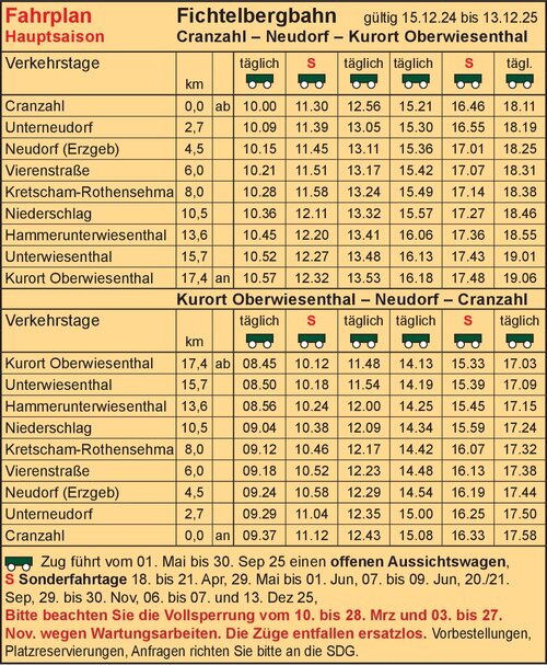 To achieve the narrow-gauge railway from the comfort of Chemnitz with the regional railways of Erzgebirgsbahn (KBS517) that offer Cranzahl connection to the trains of Fichtelbergbahn. Information on the timetables of trains and buses is available online at the Central Saxony Transport Association (VMS).